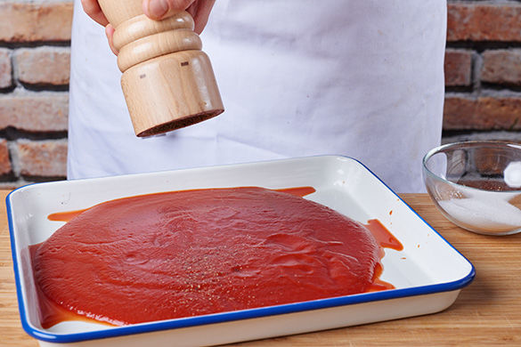Passierte Tomaten in eine Auflaufform geben, mit Salz, Pfeffer und einer guten Prise Zucker würzen.