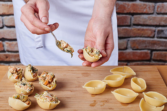 Muscheln haben immer kleine Geheimnisse. Wieso sollte das bei unserer Muschel-Pasta also anders sein? Psst, wir füllen allerlei Gemüse und Ricotta in die kleinen Schönheiten, betten sie in Tomatensauce und geben sie zum Garen in den Ofen. Wenn du ganz genau hinhörst, kannst du hören, was sie erzählen.