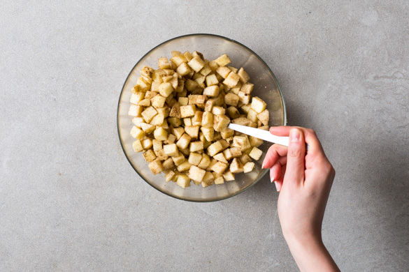 Den Backofen auf 180°C Umluft oder 200°C Ober- und Unterhitze vorheizen. Die Äpfel nach Wunsch schälen, vierteln und vom Kerngehäuse befreien. Dann in ca. 1cm große Würfel schneiden und mit dem Vanillezucker und der 1-2EL Zucker mischen. Zur Seite stellen.