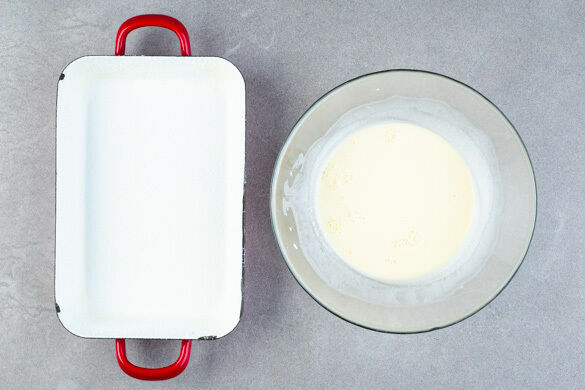 Den Backofen auf 200°C (180°C Umluft) vorheizen. Die Eier und 125ml Sahne mit einem Schneebesen verquirlen. Eine kleine Auflaufform mit etwas Butter fetten, dann mit 1EL Zucker bestreuen und die Form hin und her bewegen, sodass der Boden gleichmäßig von Zucker bedeckt ist.