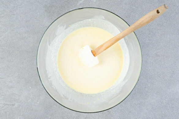 60g Mehl, ½TL Orangenschale, 3EL Zucker und 1 kräftige Prise Salz vermengen. Allmählich die Eier-Sahne-Mischung unterrühren und alles gut vermischen, dann die geschmolzene Butter einrühren.