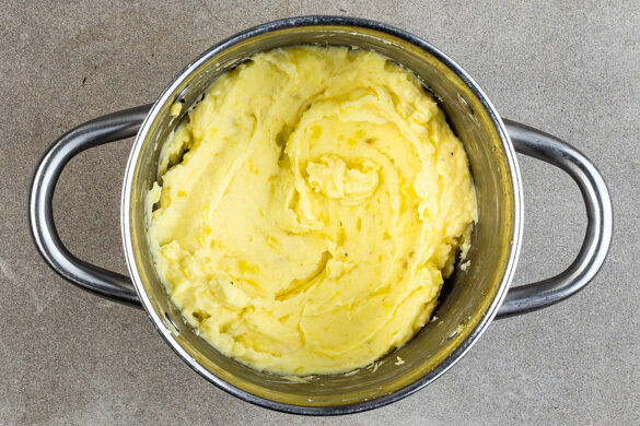 Den Backofen auf 240°C (220°C Umluft) vorheizen. In einem mittelgroßen Topf ausreichend gesalzenes Wasser für die Kartoffeln zum Kochen bringen. Die Kartoffeln schälen und je nach Größe halbieren oder vierteln, dann in das kochende Wasser geben und in 10–12Min. gar kochen. In ein Sieb abgießen, zurück in den Topf geben und abgedeckt warm halten.