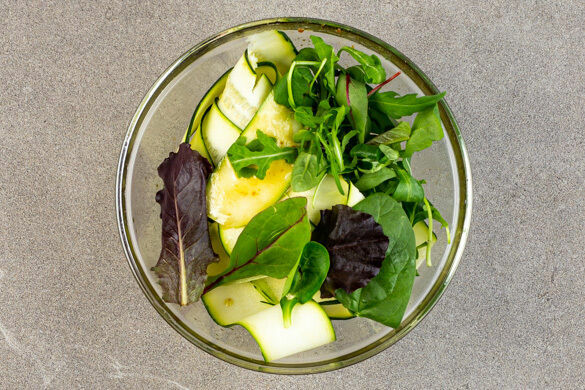 Die Basilikumblätter von den Stängeln zupfen und grob schneiden. 1EL Olivenöl, 1TL Essig, 1TL Honig und 1TL Senf zu einem Dressing verrühren. Die Zucchinistreifen und den gemischten Salat mit dem Dressing vermengen. Mit Salz und Pfeffer abschmecken.