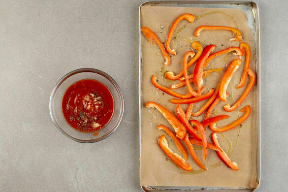 Den Backofen auf 240°C (220°C Umluft) vorheizen. Die Paprika vierteln, entkernen, in dünne Streifen schneiden und auf einem mit Backpapier ausgelegten Backblech mit 2EL Olivenöl und je 1 Prise Salz und Pfeffer einreiben. Den Knoblauch schälen und fein würfeln oder durch eine Knoblauchpresse drücken, dann mit der Tomatensauce, 2TL Honig und je 1 Prise Salz und Pfeffer verrühren.