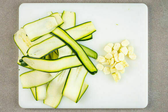 Die Paprika im Ofen 6–8Min. backen, bis sie beginnen, weich zu werden. Die Zucchini mit einem Sparschäler rundum in breite Streifen schneiden, das weiche Kerngehäuse quer in dünne Scheiben schneiden.