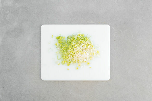 In einem mittelgroßen Topf ausreichend gesalzenes Wasser für die Pasta zum Kochen bringen. Den Lauch längs halbieren und quer in dünne Streifen schneiden.