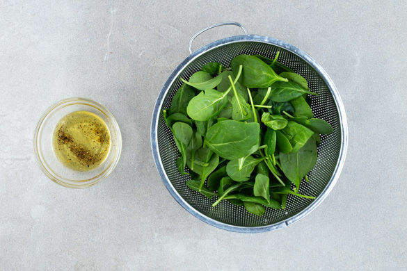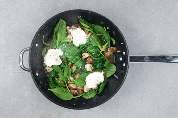 Die Pilze und die restlichen Zwiebeln in der Pfanne mit 2TL Olivenöl bei starker Hitze ca. 3Min. scharf anbraten. Die Hitze reduzieren und 1EL Mehl unterrühren, dann mit 200–250ml Wasser ablöschen. Die ½ des Spinats und die Crème fraîche dazugeben und rühren, bis der Spinat zusammengefallen ist. Mit Salz und Pfeffer abschmecken und bis zum Anrichten sanft köcheln lassen.