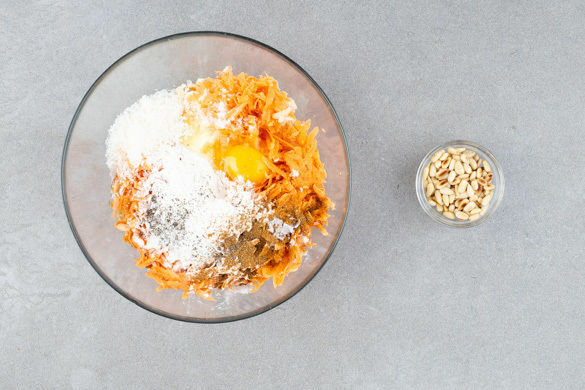 Die Pinienkerne in einer großen Pfanne ohne Fett ca. 2Min. anrösten. Die Gemüseraspel mit dem Käse, 1 Ei, 5EL Mehl, der Gewürzmischung und je 1 kräftigen Prise Salz und Pfeffer verkneten. Die Röstimasse in 8 gleich große Portionen teilen und diese ggf. portionsweise in der Pfanne mit 1EL Olivenöl bei mittlerer Hitze auf jeder Seite 3–4Min. knusprig anbraten.