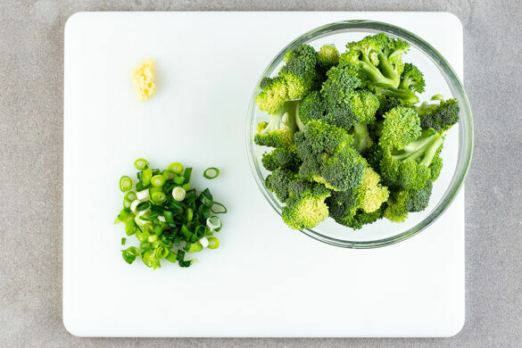 In einem mittelgroßen Topf ausreichend gesalzenes Wasser für den Brokkoli zum Kochen bringen. In einem kleinen Topf 400ml leicht gesalzenes Wasser für die Quinoa aufkochen. Den Brokkoli in mundgerechte Röschen schneiden. Die Lauchzwiebel in feine Ringe schneiden. Den Knoblauch schälen und fein reiben oder durch eine Knoblauchpresse drücken.