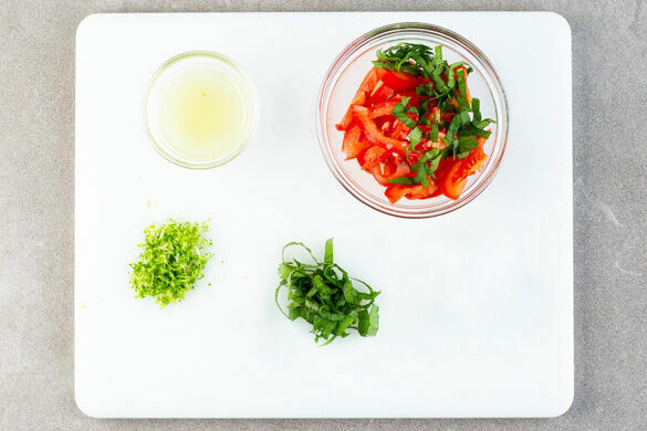 Die Limettenschale abreiben, dann die Limette halbieren und auspressen. Die Kräuter samt Stängeln fein schneiden. Die Tomate in dünne Spalten schneiden und mit der ½ der Kräuter, der ½ des Limettensafts und 1EL Olivenöl vermengen. Die Salsa mit Salz abschmecken.