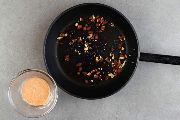 Die Sriracha-Sauce mit dem Knoblauch, dem restlichen Limettensaft und 4EL veganer Mayonnaise verrühren. Mit der Limettenschale und Salz abschmecken. Die Mandeln grob hacken und in einer großen Pfanne ohne Zugabe von Fett bei mittlerer Hitze 1–2Min. goldbraun anrösten. Vorsicht, sie können schnell zu dunkel werden. Auf einem Teller beiseitestellen.