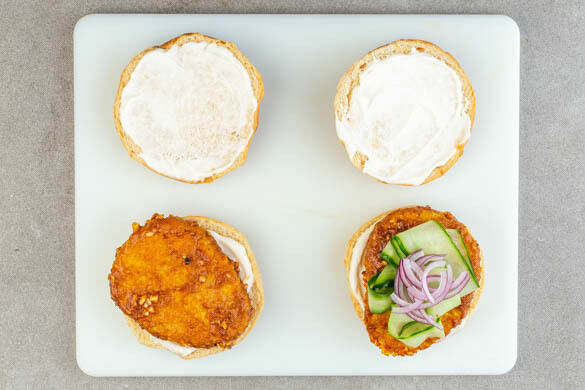 Die Brötchen auf einem Backrost 1–2Min. im Ofen aufknuspern. Anschließend aufschneiden, mit 2EL veganer Mayonnaise bestreichen und mit den Schnitzeln belegen. Die Miso-Würzsauce auf den Schnitzeln verstreichen und mit den Zwiebeln und den Gurken belegen. Die Burger mit den Karottenpommes servieren.