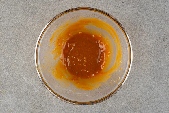 Den Knoblauch schälen, fein würfeln und mit der Misopaste, 1EL Ahornsirup und 1TL hellem Essig verrühren.