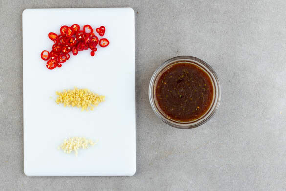 Die Limettenschale abreiben, dann die Limetten halbieren und auspressen. Den Limettensaft und die Sojasauce mit der Limettenschale, 2TL Zucker und 1½EL Mehl verrühren, dann 180ml kaltes Wasser nach und nach einrühren, damit sich keine Klumpen bilden.
