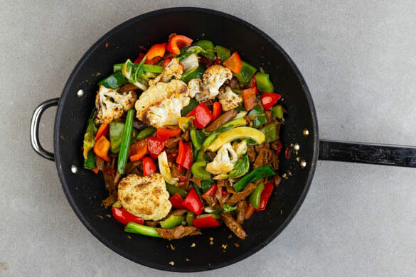 RS Paprika-„Rindfleisch“-Wok vegan mit geröstetem Blumenkohl und Erdnüssen