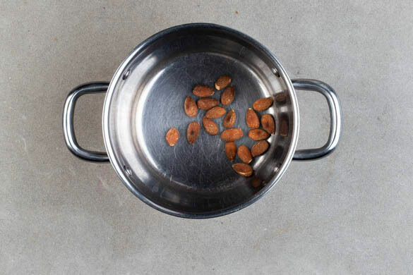 Die Rauchmandeln in einem mittelgroßen Topf ohne Fett bei mittlerer bis starker Hitze in 1–2Min. goldbraun anrösten, dann beiseitestellen. Im gleichen Topf ausreichend gesalzenes Wasser für den Grünkohl und die Pasta zum Kochen bringen.