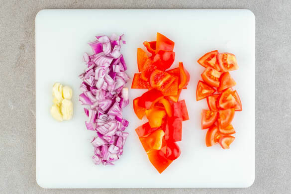 Die Zwiebel schälen, halbieren und grob würfeln. Den Knoblauch mit der flachen Seite eines Messers zerdrücken und die Schale entfernen. Die Paprika vierteln, entkernen und grob in ca. 2cm große Stücke schneiden. Die Tomate grob würfeln.