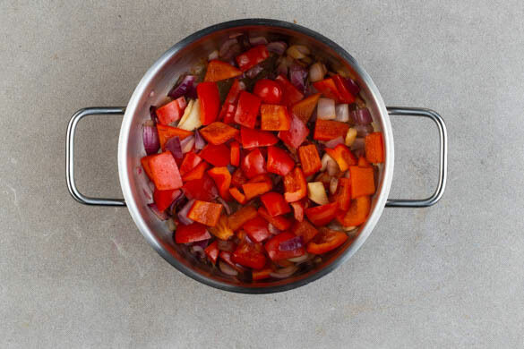 In einem weiteren mittelgroßen Topf die Zwiebeln, den Knoblauch und die Paprika ohne Öl bei starker Hitze 2–3Min. anrösten, dabei gelegentlich umrühren. Das Gemüse soll ruhig ein paar dunkle Stellen bekommen. Dann auf mittlere Hitze reduzieren, die Tomaten und die ½ des Tomatenmarks zugeben und ca. 100ml Wasser angießen, sodass das Gemüse knapp bedeckt ist.