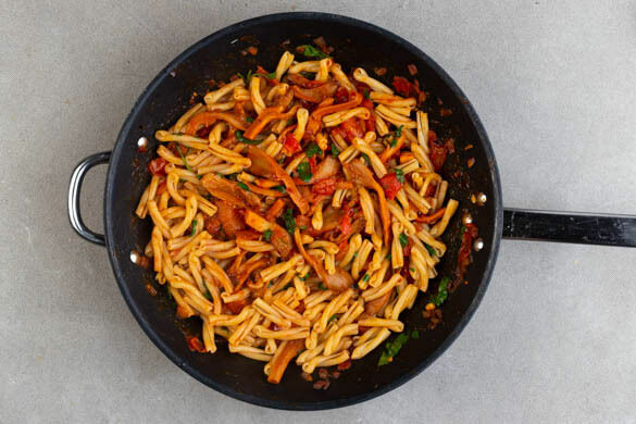 Die Pasta in das kochende Wasser geben und in 6–8Min. bissfest kochen. 1 Tasse Pastawasser abschöpfen, dann die Pasta in ein Sieb abgießen und abtropfen lassen. Währenddessen den Deckel von der Pfanne nehmen und die Sauce offen weitere 4–5Min. einköcheln und andicken lassen. Mit Salz und Pfeffer abschmecken.