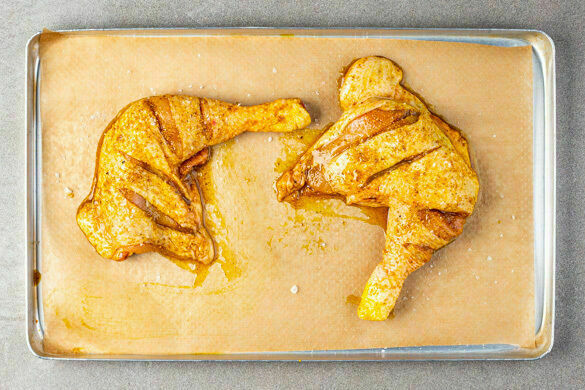 Den Backofen auf 250°C (230°C Umluft) vorheizen. Die ½ des Currypulvers mit 2EL Pflanzenöl und ½TL Salz verrühren. Die Hähnchenschenkel trocken tupfen, 2–3-mal bis zu den Knochen einschneiden und mit dem Würzöl einreiben. Auf einem mit Backpapier ausgelegten Backblech 35–50Min. auf der untersten Schiene backen. Ggf. mit Alufolie abdecken, falls die Haut zu dunkel wird.
