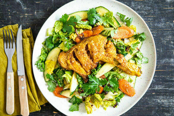 Die gerösteten Karotten und Zwiebeln mit dem Salat, den Gurkenstreifen und dem Kokos-Limetten-Dressing vermengen. Die Hähnchenschenkel auf dem Salat anrichten und mit dem Koriander garniert servieren.