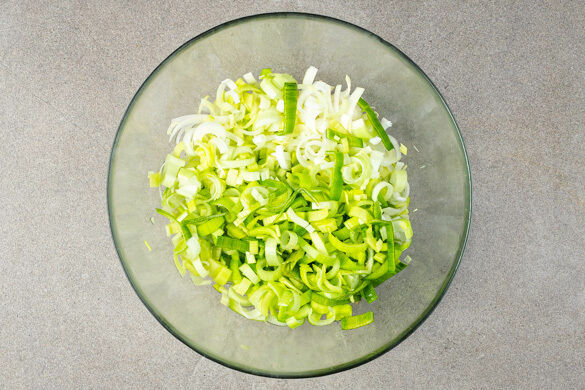 Den Backofen auf 230°C (210°C Umluft) vorheizen. In einem großen Topf ausreichend gesalzenes Wasser für die Pasta und den Blumenkohl zum Kochen bringen. Den Lauch längs halbieren und quer in feine Streifen schneiden.