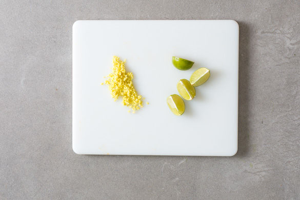 In einem mittelgroßen Topf ausreichend leicht gesalzenes Wasser für die Nudeln zum Kochen bringen. Den Ingwer schälen und in feine Würfel schneiden. Die Limette in Spalten schneiden. Tipp: Ingwer lässt sich am Besten mit einem kleinen Teelöffel schälen.