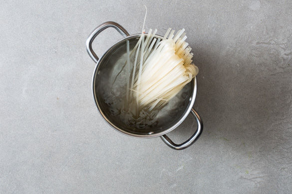 Sobald das Nudelwasser kocht, die Hitze runter drehen und die Reisbandnudeln zugedeckt ca. 7-8Min. gar ziehen lassen. Durch ein Sieb abgießen und warm halten.