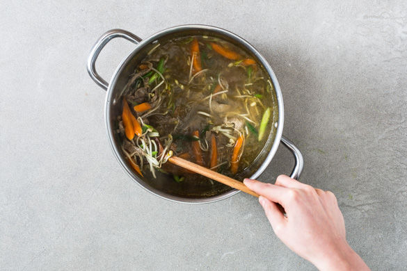 In einem großen Topf 1,3L Wasser aufkochen lassen, die Brühwürfel darin auflösen und mit Ingwer und Gewürz ca. 5-10Min. auf mittlerer Hitze ziehen lassen.