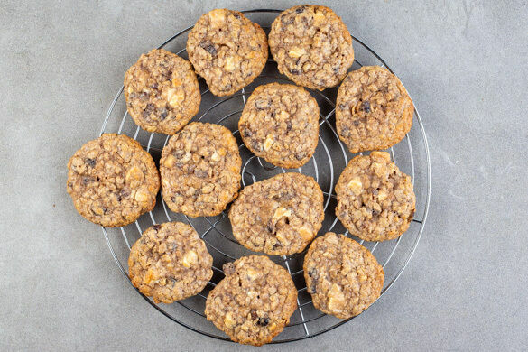 Die Kekse auf dem Blech ca. 5Min. abkühlen lassen, dann auf einem Backrost oder Kuchengitter vor dem Verzehr vollständig auskühlen lassen.
