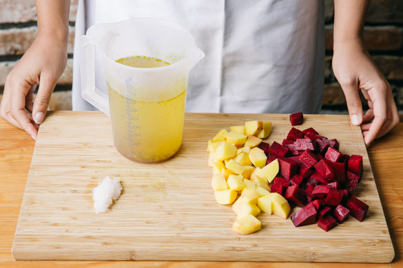 Den Ofen auf 200°C Umluft vorheizen. Die Rote Beete und Kartoffeln schälen und in ca. 1-2cm große Würfel schneiden. Tipp: Rote Beete färbt, mit Handschuhen arbeiten. Den Meerrettich schälen und fein reiben. Vorsicht, scharf! Den Knoblauch schälen und fein hacken. 600-800ml Wasser in einem Wasserkocher aufkochen lassen und den Brühwürfel darin auflösen.