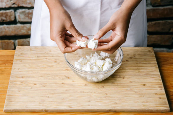 Dem Feta mit den Fingern zerkrümeln oder grob schneiden. Die Suppe auf Teller anrichten, Fetakäse und Kräuterpesto darauf verteilen und mit Pita-Chips servieren.