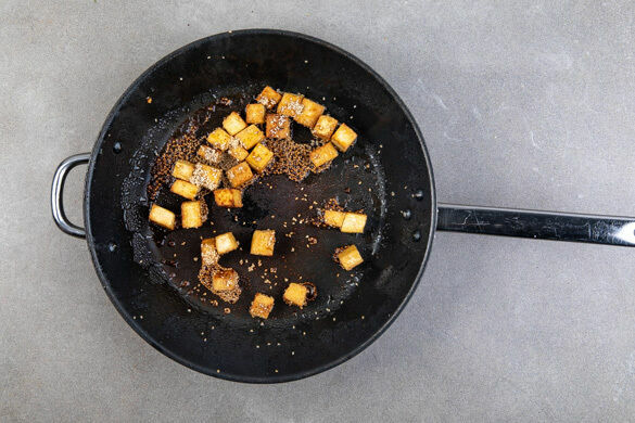 Den Tofu in 1–2cm große Würfel schneiden und in einer mittelgroßen Pfanne mit 1EL Pflanzenöl bei mittlerer Hitze ca. 5Min. von allen Seiten knusprig anbraten. Die Sojasauce, 1–2TL Zucker und den Sesam verrühren. Die Pfanne vom Herd nehmen, den Tofu mit der Würzsauce ablöschen und auf einem Teller beiseitestellen.