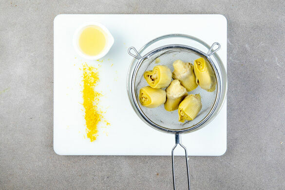 Den Backofen auf 220°C (200°C Umluft) vorheizen. In einem mittelgroßen Topf 600ml leicht gesalzenes Wasser für den Bulgur zum Kochen bringen. Die Artischocken in ein Sieb abgießen und anschließend mit etwas Küchenpapier trocken tupfen. Die Zitronenschale abreiben, dann die Zitrone halbieren und auspressen.