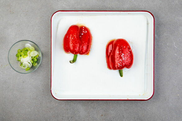 Die Paprika halbieren, entkernen und mit 1EL Olivenöl sowie 1 Prise Salz einreiben. Mit der Schnittseite nach unten auf ein mit Backpapier ausgelegtes Backblech geben und im Ofen auf der obersten Schiene 15–20Min. rösten, bis die Haut anfängt, Blasen zu werfen. Die Lauchzwiebeln in feine Ringe schneiden.