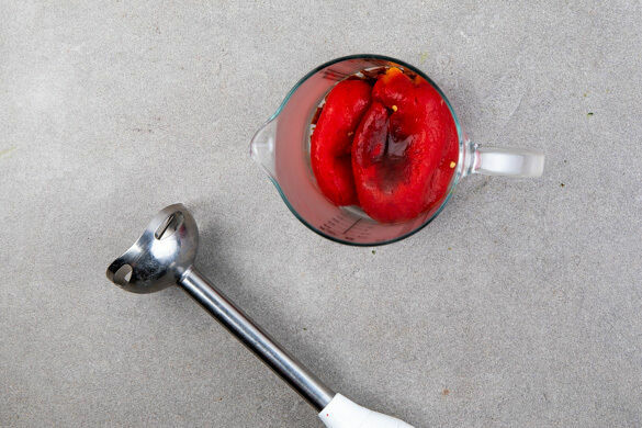 Die getrockneten Tomaten grob schneiden. Die geröstete Paprika und die getrockneten Tomaten in einem hohen Gefäß mit einem Stabmixer fein pürieren und den Dip mit Salz und Pfeffer abschmecken. Etwas Wasser hinzufügen, falls der Dip zu dickflüssig ist.
