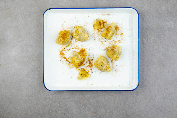 Die Artischocken mit der ½ des Currypulvers oder mehr nach Geschmack, 1EL Olivenöl sowie je 1 Prise Salz und Pfeffer vermengen und auf einem weiteren mit Backpapier ausgelegten Backblech verteilen. Im Ofen auf einer unteren Schiene ca. 25Min. rösten.