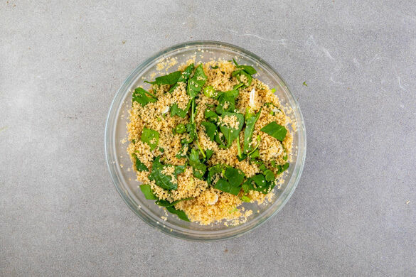 Den Bulgur in das kochende Wasser rühren und abgedeckt bei niedriger Hitze 5–7Min. sanft köcheln lassen, bis das Wasser aufgesaugt und der Bulgur gar ist. Noch ca. 5Min. ohne Hitzezufuhr ziehen lassen.