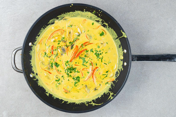 Die Paprika vierteln, entkernen und in dünne Streifen schneiden. Die Pilze ggf. säubern und in dünne Scheiben schneiden. Den Knoblauch in einer großen Pfanne mit 1EL Pflanzenöl bei mittlerer Hitze ca. 30Sek. anbraten. Die Paprika, die Pilze und das Currypulver dazugeben und 2–3Min. braten. Mit Salz und Pfeffer abschmecken.