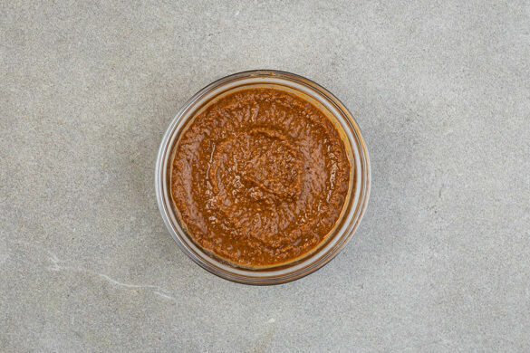 Die Walnüsse grob hacken. Den Knoblauch schälen und mit ¾ der Walnüsse, 1EL Ahornsirup, 1EL Olivenöl und 2TL Balsamicoessig in einem hohen Gefäß mit einem Stabmixer grob pürieren. Anschließend 50–75ml Wasser hinzufügen und alles möglichst cremig pürieren. Die Sauce nach Geschmack mit mehr Ahornsirup, Balsamicoessig und Salz verfeinern.