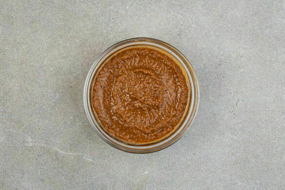 Die Walnüsse grob hacken. Den Knoblauch schälen und mit ¾ der Walnüsse, 2EL Ahornsirup, 2EL Olivenöl und 1EL Balsamicoessig in einem hohen Gefäß mit einem Stabmixer grob pürieren. Anschließend 100ml Wasser hinzufügen und alles möglichst cremig pürieren. Die Sauce nach Geschmack mit mehr Ahornsirup, Balsamicoessig und Salz verfeinern.