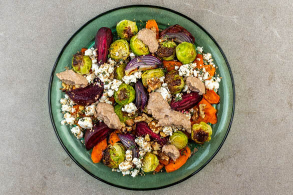 Achtung, hier kommt eine echte Geschmacksbombe – und die hat ganz schön Karacho drauf. Da ist jeder Widerstand zwecklos. Aber wer kann bei leckerem Ofengemüse aus Rosenkohl, Karotte, Zwiebel und Roter Bete mit einem leckeren Topping aus Feta, Sesam und Zitronenthymian samt herrlich aromatischem Dip mit Walnüssen, Knoblauch und Ahornsirup schon Nein sagen?