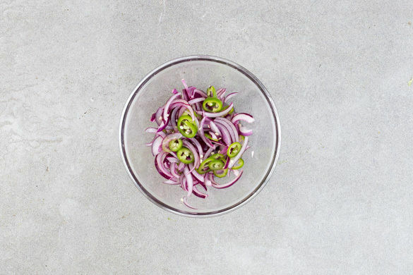 Die Zwiebel schälen, halbieren und in feine Streifen schneiden. Die Chilischote längs halbieren und in feine Streifen schneiden. Tipp: Für weniger Schärfe die Kerne entfernen. Die Zwiebeln und die Chilistreifen mit 2EL Essig, 1TL Zucker und ½TL Salz vermengen und beiseitestellen.