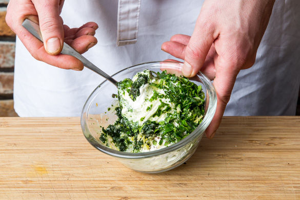 Nun den Basilikum mit der Hälfte der Petersilie, der Hälfte des Knoblauchs (je nach Geschmack weniger oder mehr verwenden), Crème fraîche, 1-2TL Zitronenabrieb und 1-2TL Zitronensaft mischen. Mit Salz und Pfeffer abschmecken.