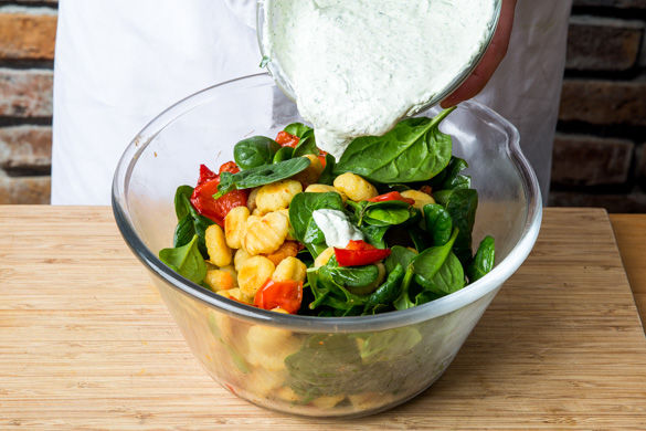 Diese knusprigen Kartoffelklößchen sind der Hit! Die passen nämlich super zu saftig-gegrillter Paprika und frischem Baby-Spinat. Dazu gibt es noch eine herbe Kräuter-Creme, die den Frühling mit ins Esszimmer holt.