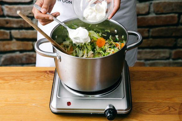 Die Crème fraîche unter das Gemüse rühren. Mit der Gewürzmischung nach Geschmack verfeinern und das Ragout abgedeckt 6–7Min. köcheln lassen. Mit Salz und Pfeffer abschmecken.