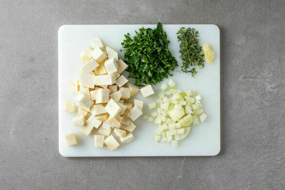 Den Backofen auf 240°C (220°C Umluft) vorheizen. Die Zwiebeln schälen, halbieren und grob würfeln. Die Pastinaken ggf. schälen und in 1–2cm große Würfel schneiden. Die Thymianblätter von den Stängeln streifen. Die Petersilienblätter grob, die -stängel fein schneiden. Den Knoblauch schälen und fein würfeln oder reiben.
