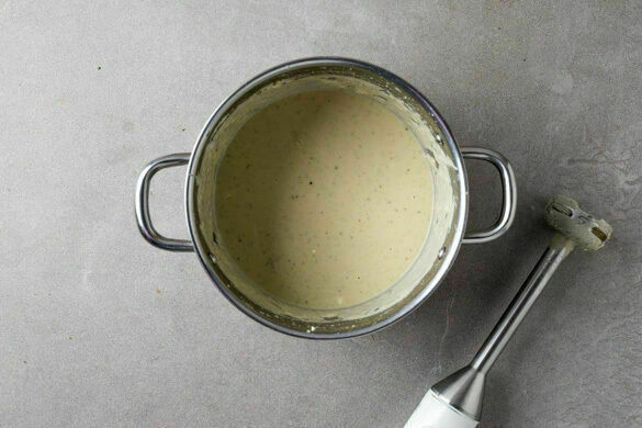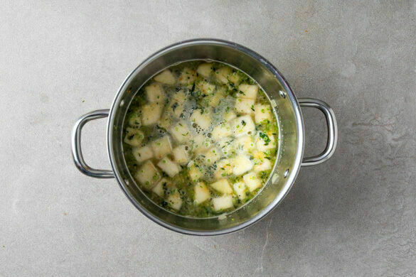 Die Zwiebeln mit 1EL Olivenöl und 1 Prise Salz in einem großen Topf bei mittlerer Hitze ca. 2Min. glasig anschwitzen. Die Pastinaken dazugeben und 1–2Min. anbraten. Den Thymian, die Petersilienstängel und das Brühgewürz hinzufügen. 1,2L Wasser angießen, die Brühe zum Kochen bringen und das Gemüse 10–15Min. köcheln lassen, bis es weich ist.