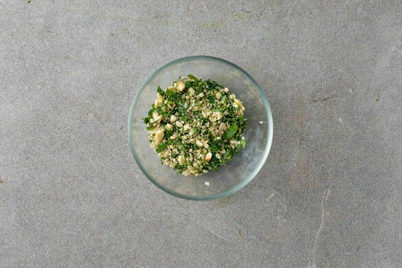 Die Mandeln grob hacken und in einer kleinen Pfanne ohne Zugabe von Fett bei mittlerer Hitze 1–2Min. goldbraun anrösten. Vorsicht, sie können schnell zu dunkel werden. Zum Abkühlen aus der Pfanne nehmen und mit der restlichen Petersilie sowie je 1 Prise Salz und Pfeffer mischen.