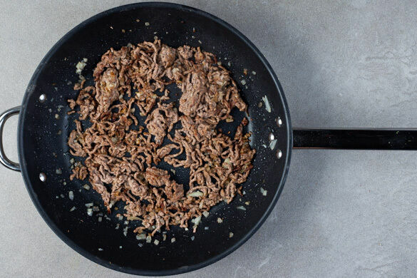 Die 1/2 des Knoblauchs und die 1/2 der Zwiebeln in einer mittelgroßen Pfanne mit 1EL Olivenöl 3–4Min. anschwitzen. Das Hackfleisch und je 1/2TL Salz und Pfeffer hinzufügen und bei mittlerer bis starker Hitze unter gelegentlichem Rühren 5–6Min. braten, bis das Hackfleisch nicht mehr rosig und ggf. austretendes Wasser vollständig verdampft ist. Die Pfanne vom Herd nehmen.